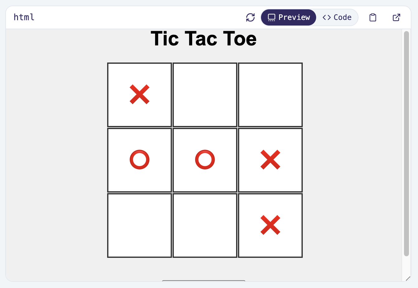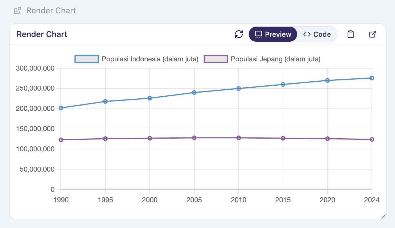 Generate code dengan AI dan lihat hasil codingnya langsung di layar chat, tidak perlu lagi copy-paste ke code editor untuk melihat hasilnya. Lebih praktis dan iterasi koding lebih cepat